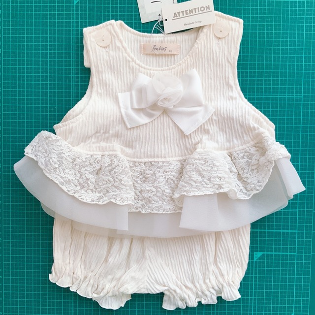 半袖パフスリーブ ドレスロンパース レース使い リボン付き 前全開きロンパース お宮参り 綿生地 ドレス 80 高級感 上品 おでかけ 激レア 平成レトロ
