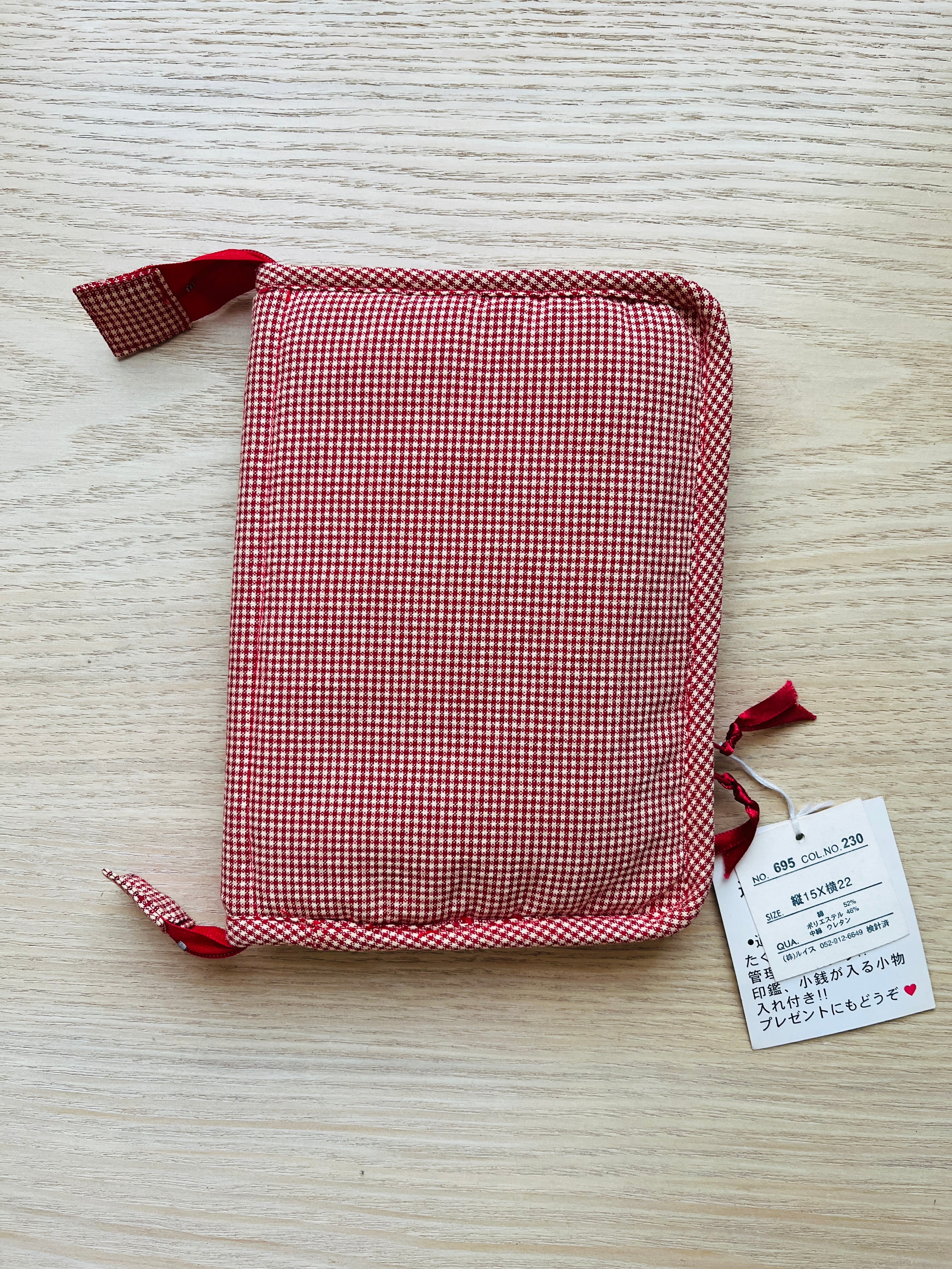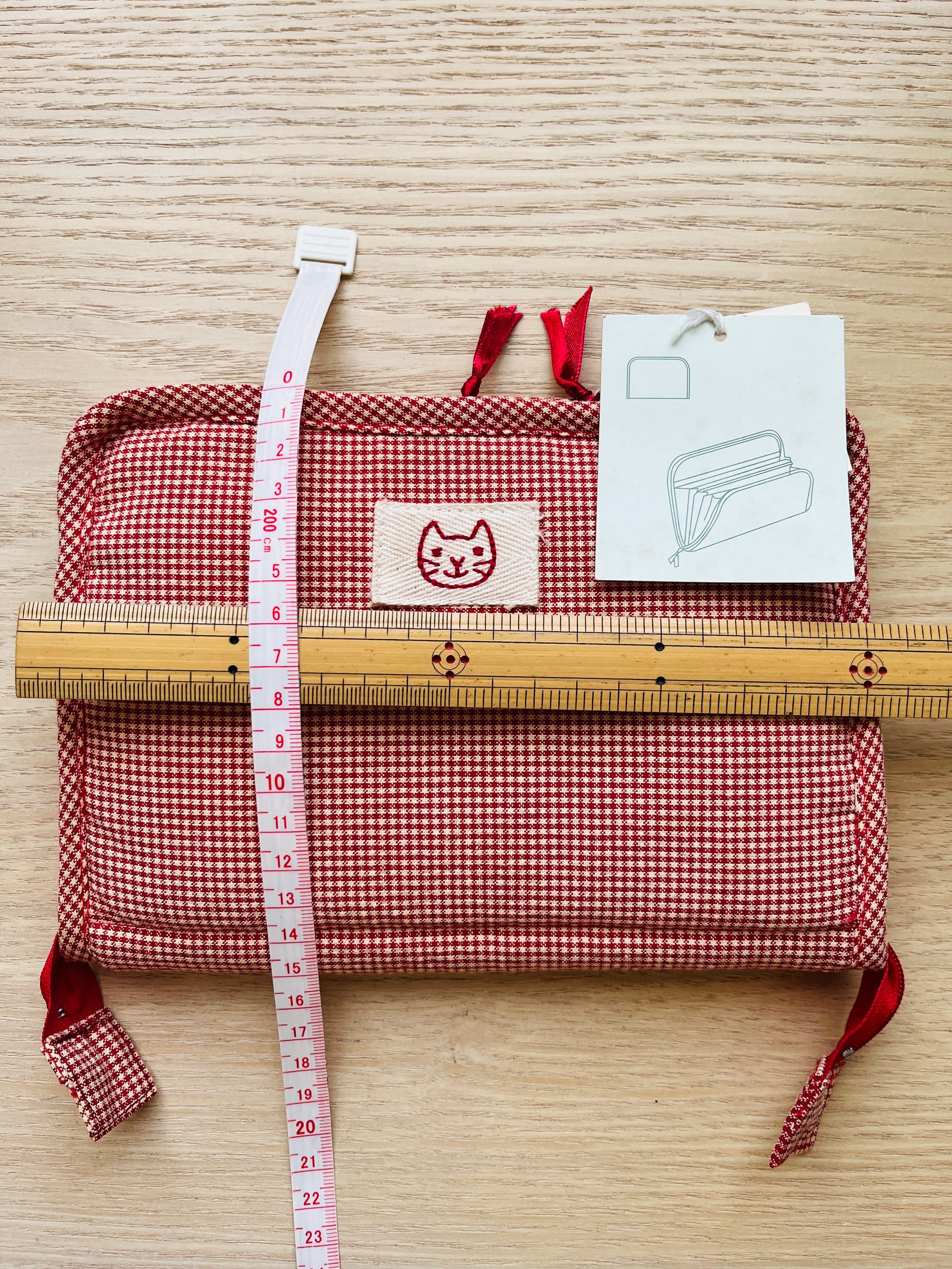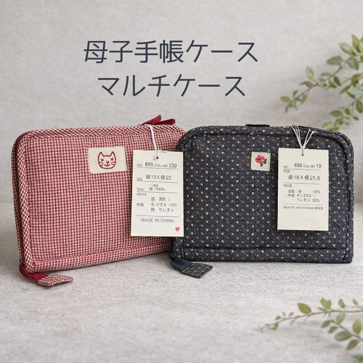母子手帳ケース マルチケース ファスナー付き 通帳ケース カードケース 2色展開 赤 濃いグレー 小花柄 猫ワッペン キルティング 収納ケース 日本製風 ビンテージ調