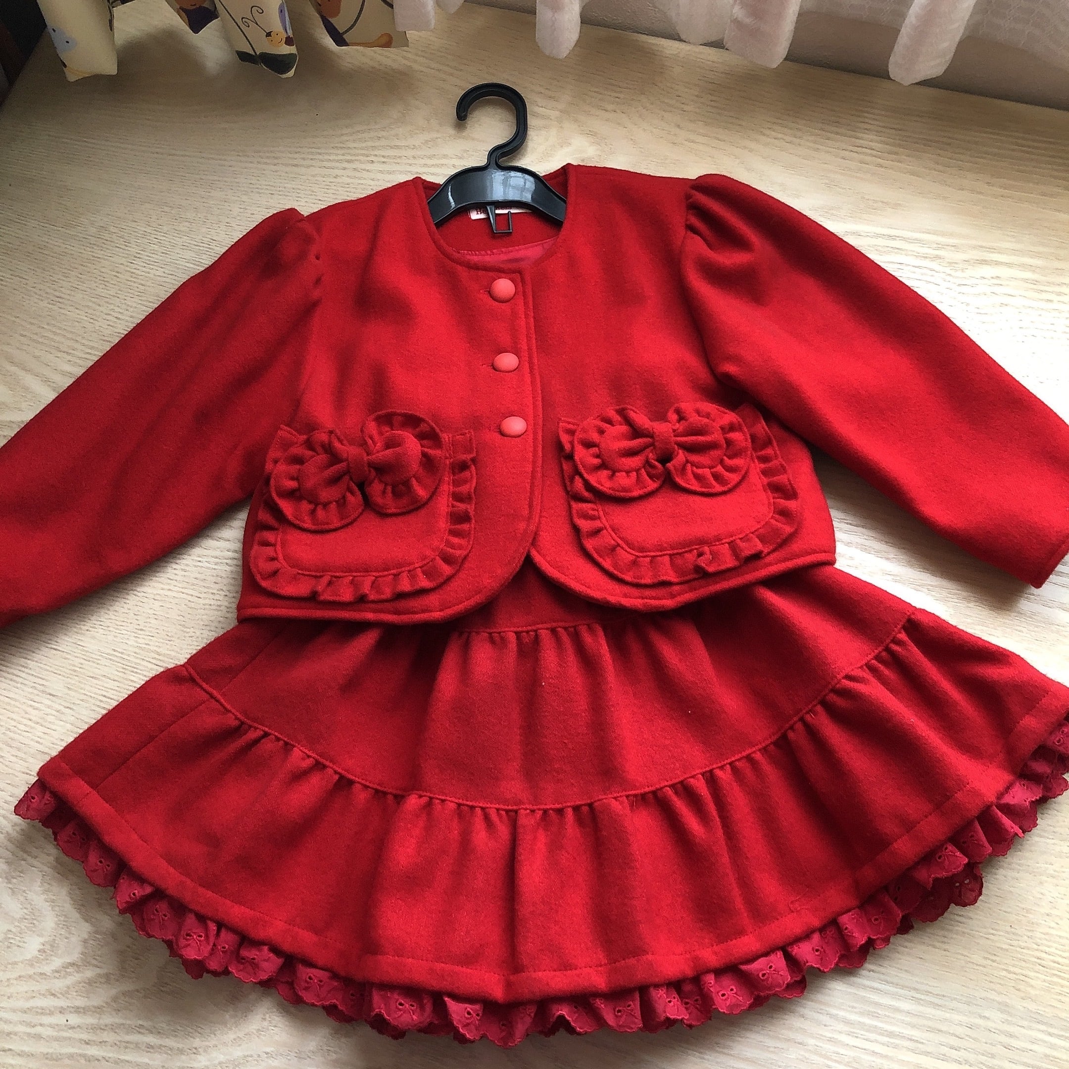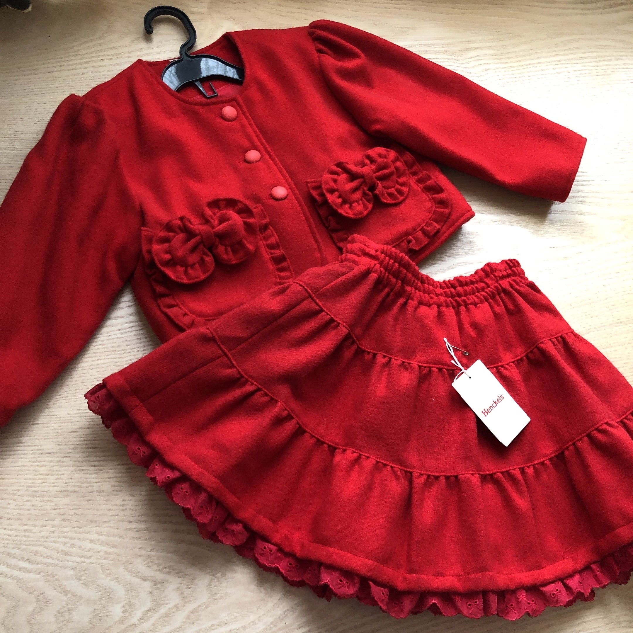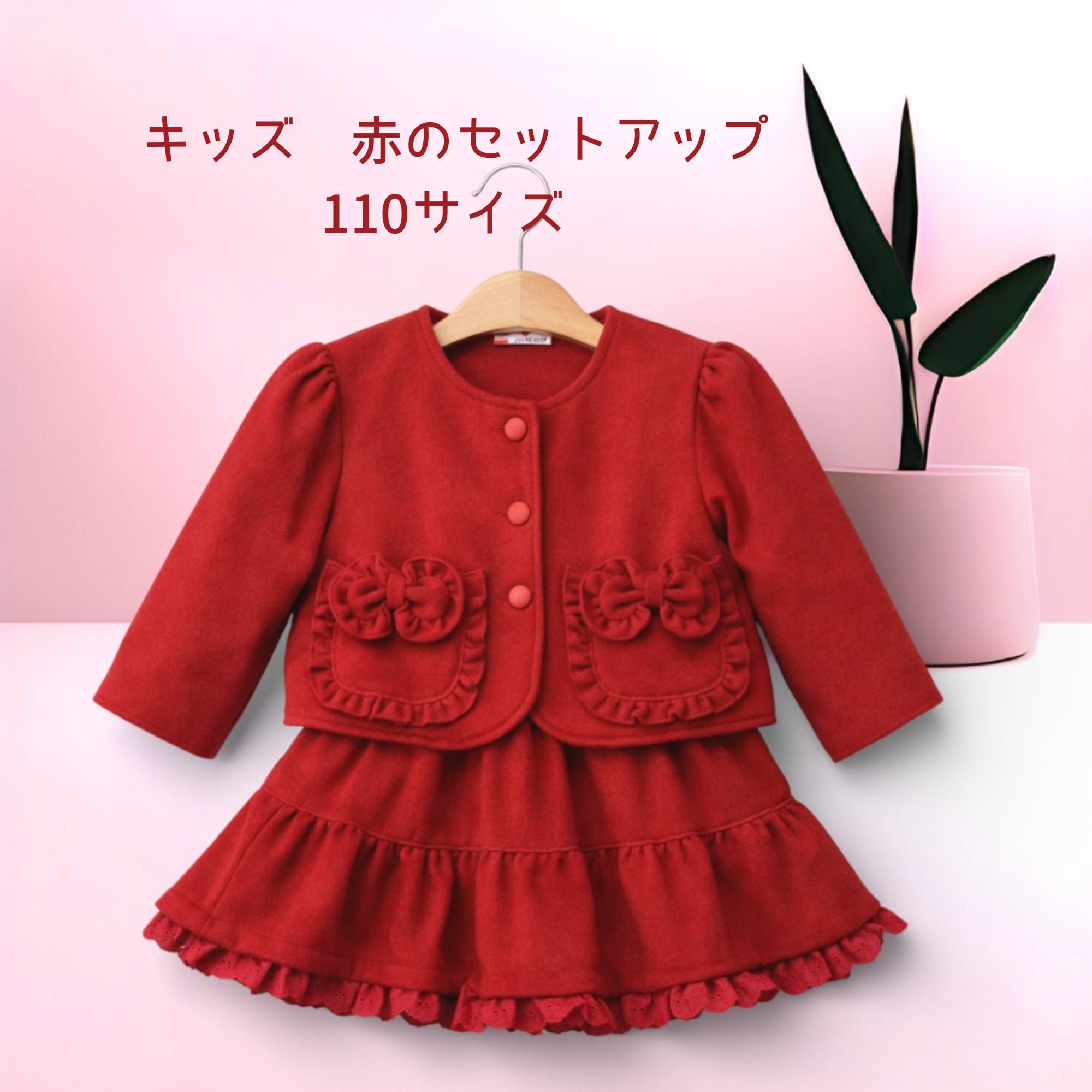 【Henckels JOA KIDS 日本製】ウール混 ボレロ&フレアスカート セットアップ レッド リボン フォーマル セレモニー 110サイズ
