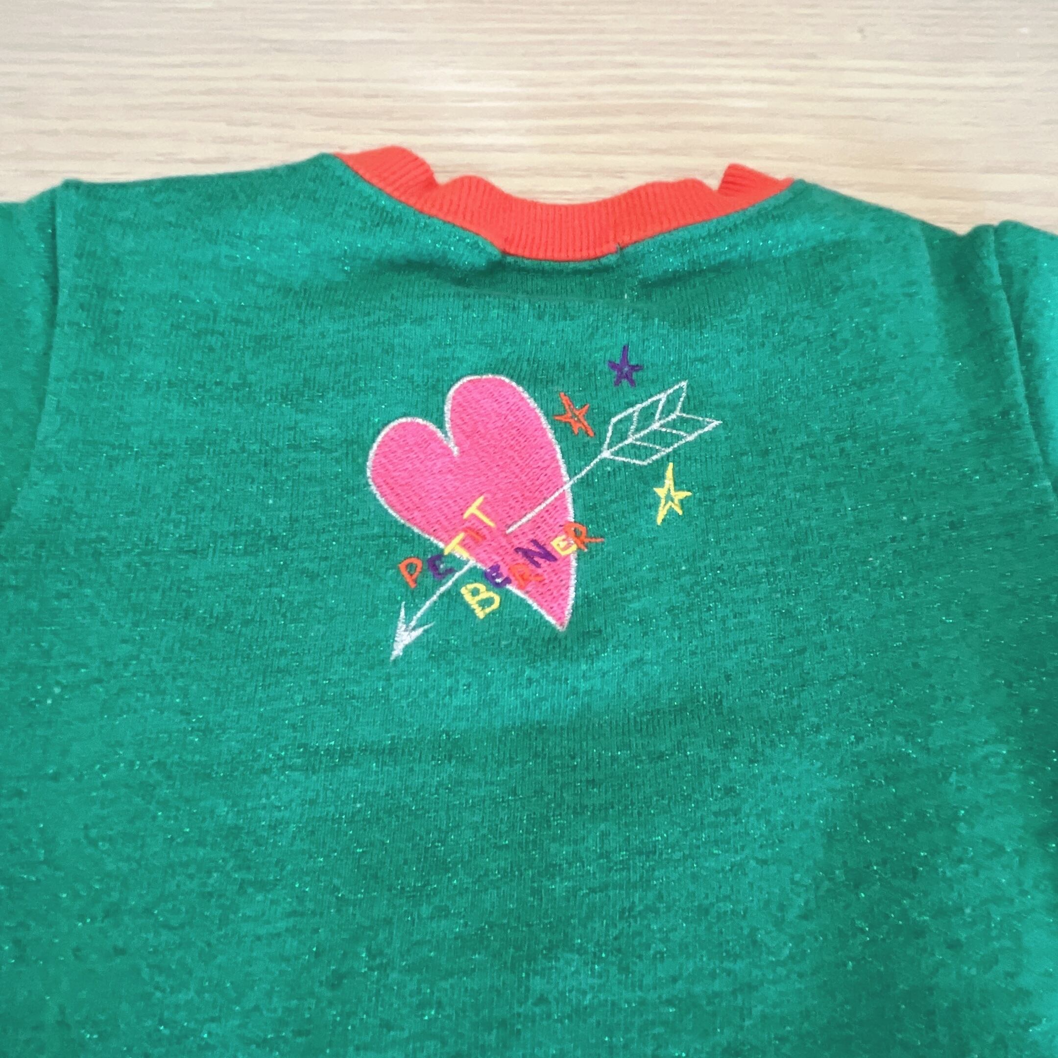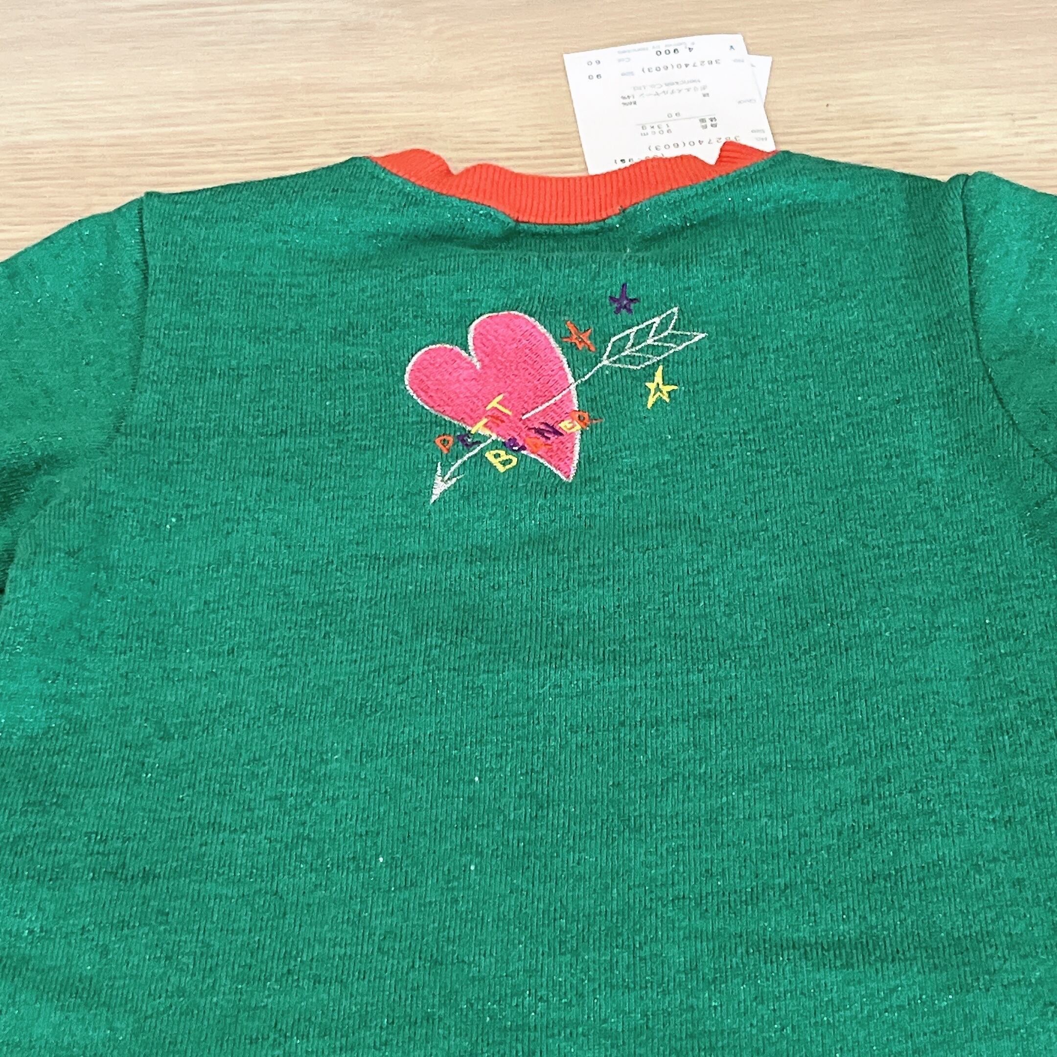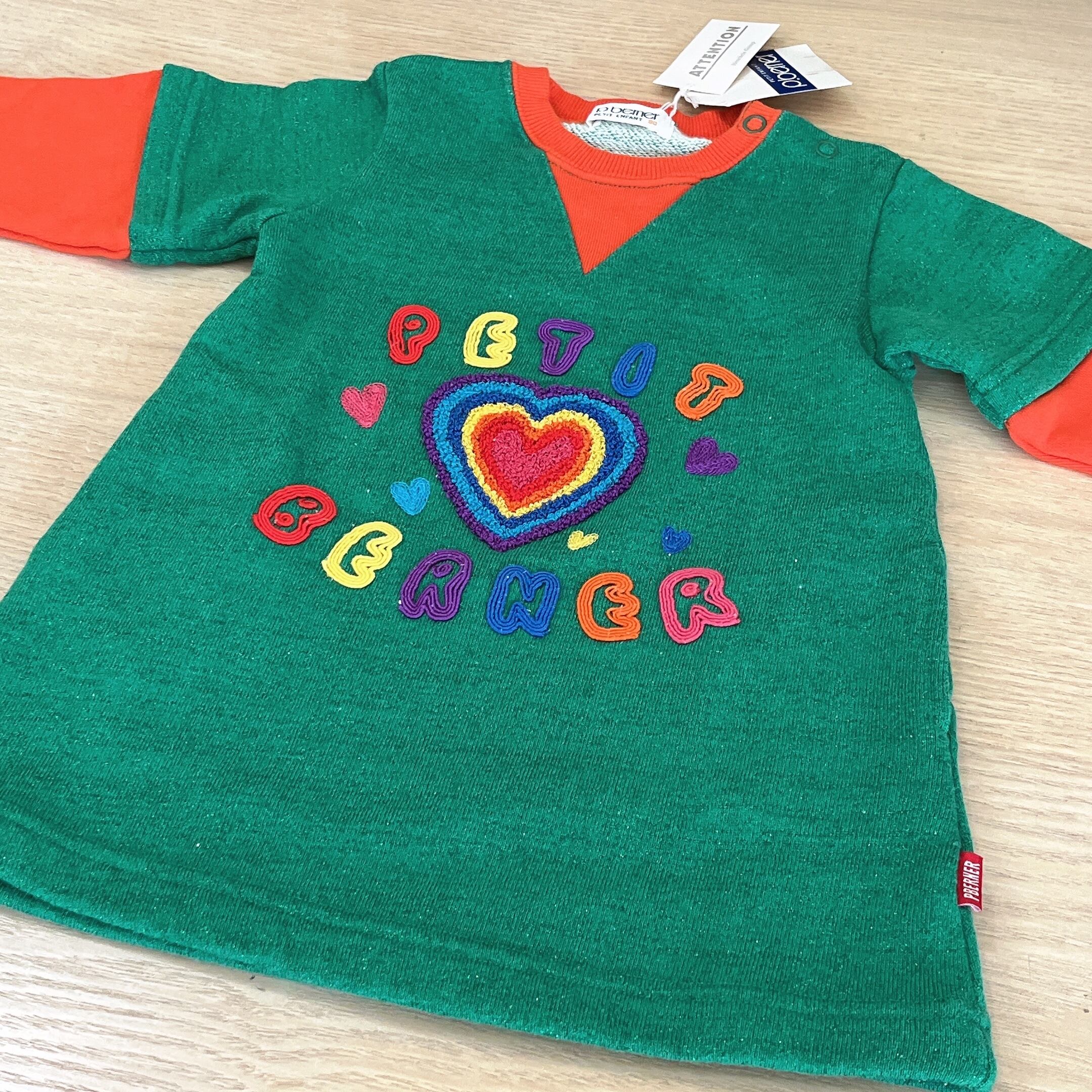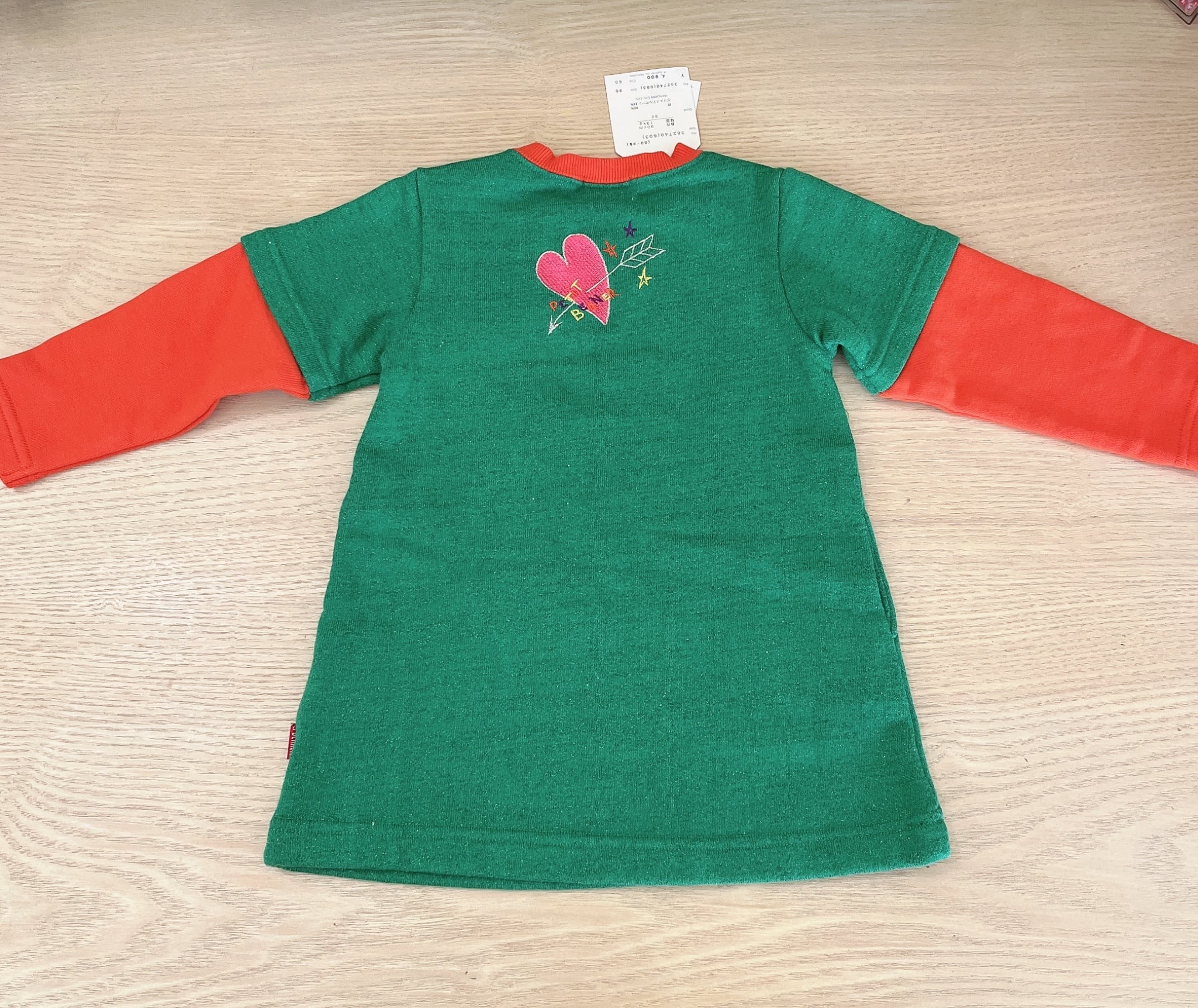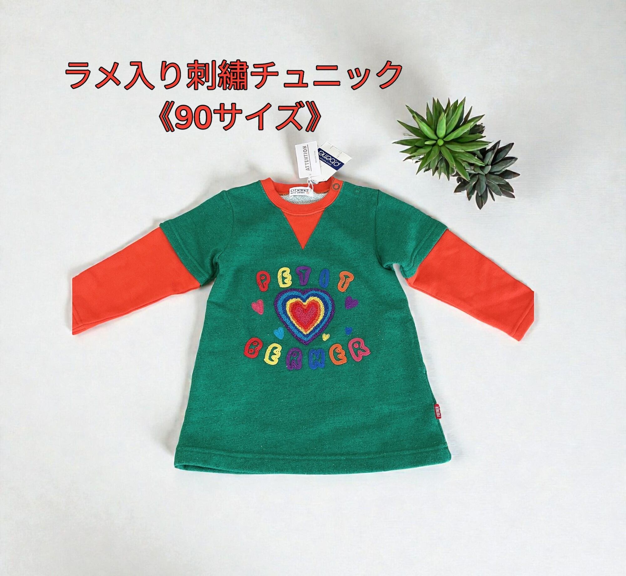 日本製 ラメ入り刺繍 チュニック 90 ハートモチーフ 長袖 バイカラー グリーン ベビー キッズ 女の子