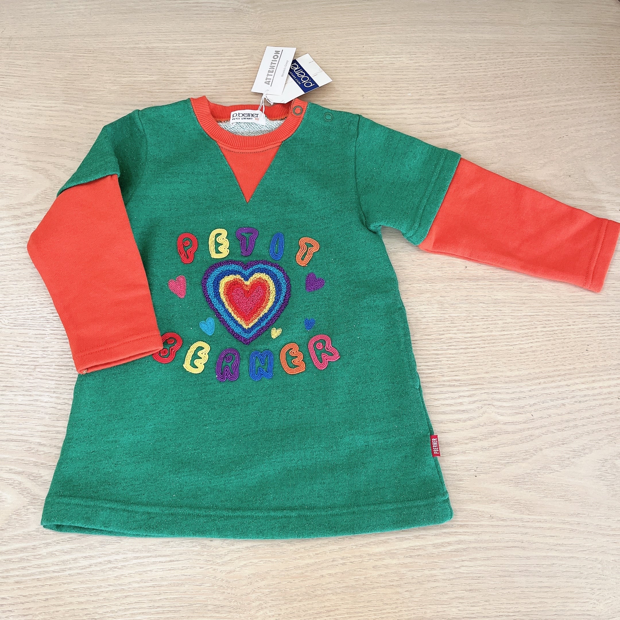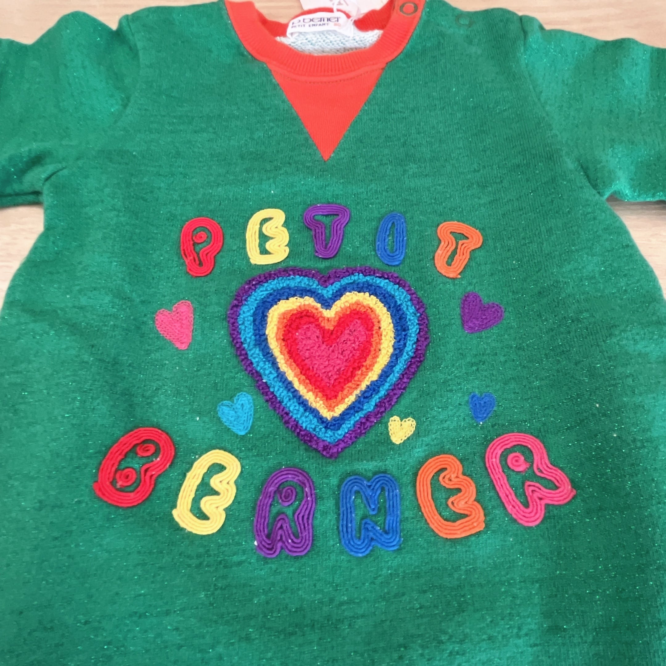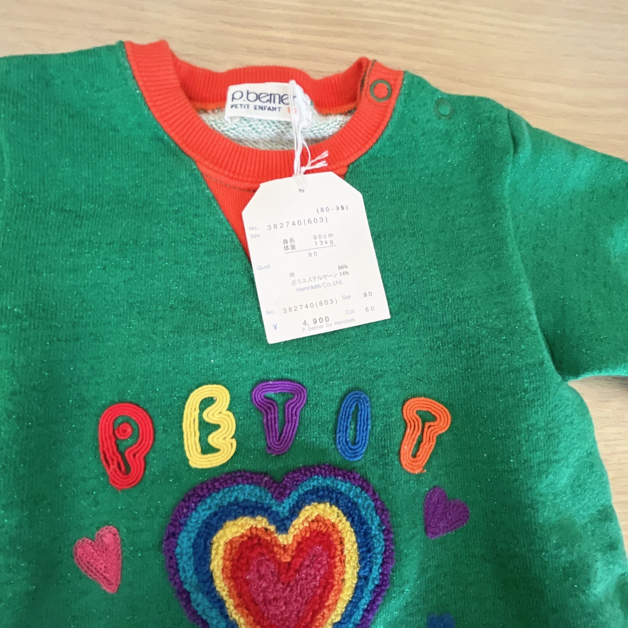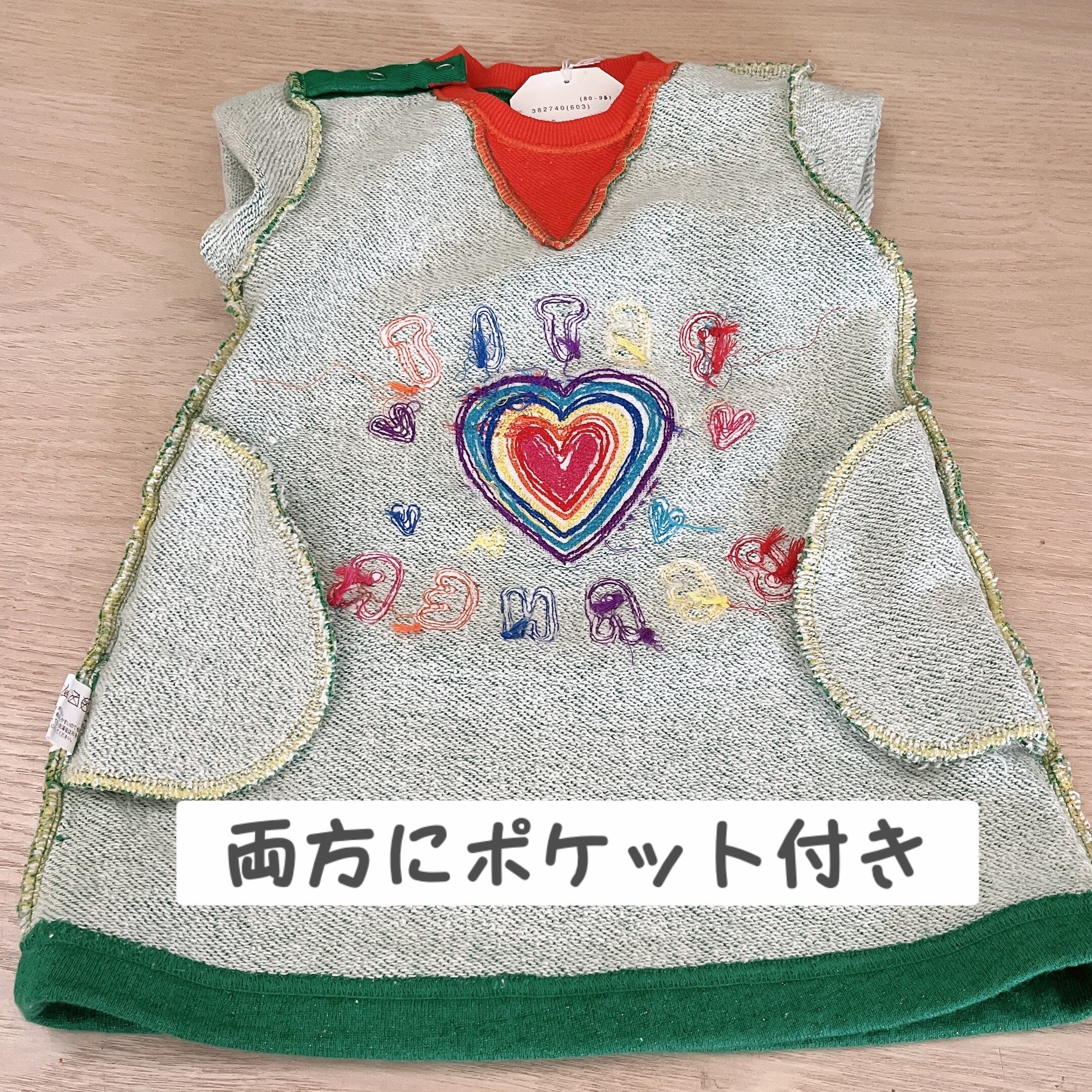 日本製 ラメ入り刺繍 チュニック 90 ハートモチーフ 長袖 バイカラー グリーン ベビー キッズ 女の子